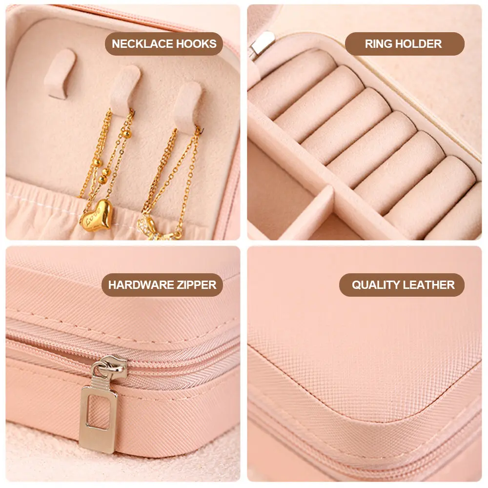 • 💼 Compact travel-size case with organized compartments for rings, earrings, necklaces, and more