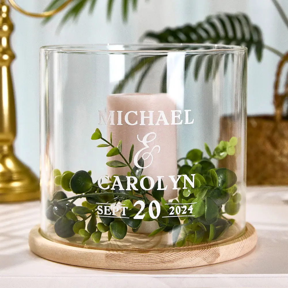 • ๐Ÿ•ฏ๏ธ Features a clear hurricane glass engraved with names, wedding date, or a meaningful phrase
