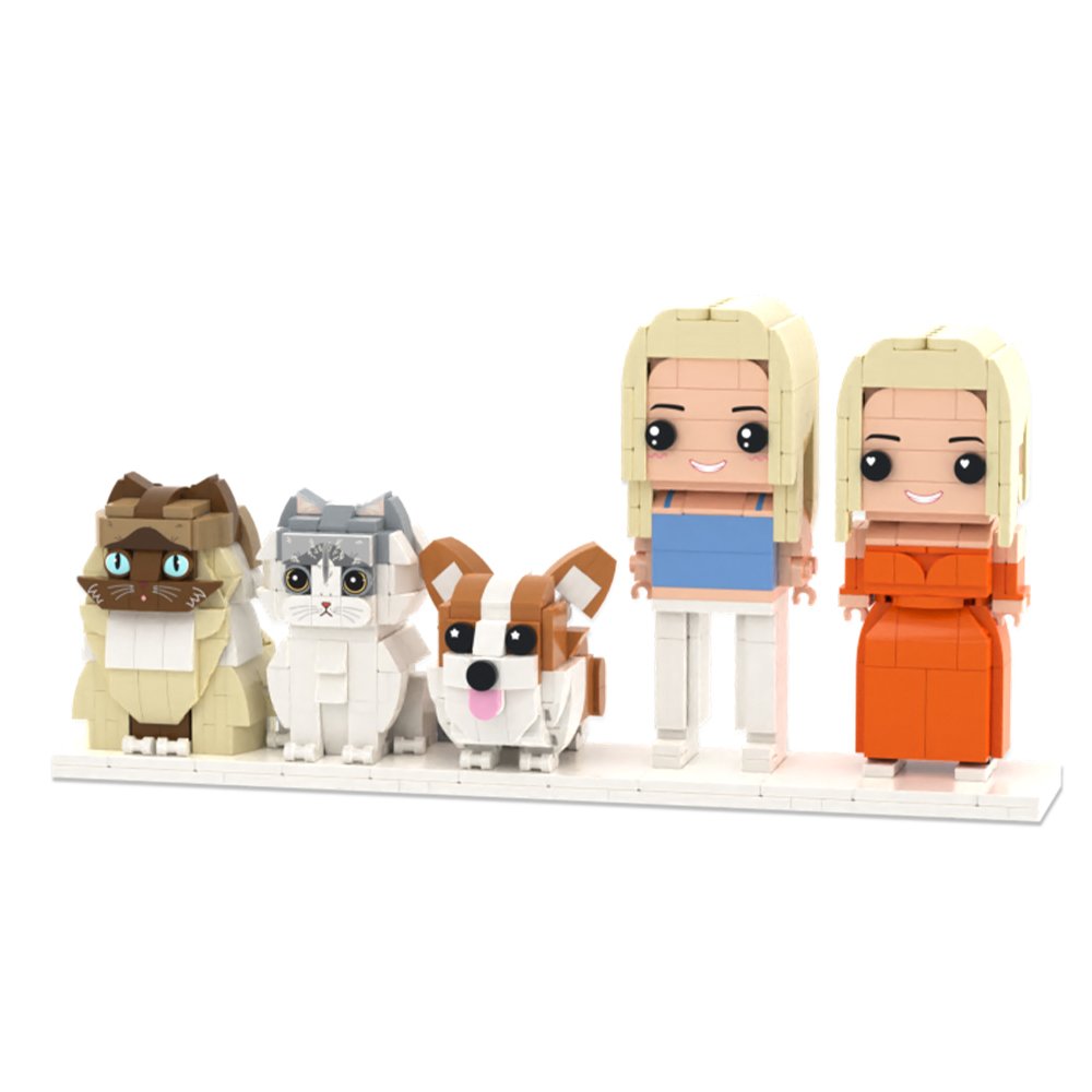 Custom brick figures set of two women with three pets, created from a reference photo, displayed on a platform in a colorful outdoor scene