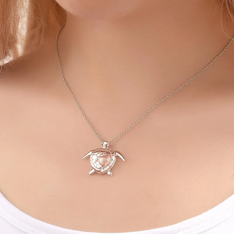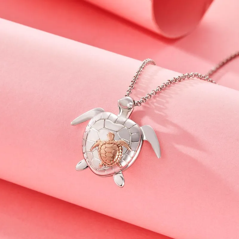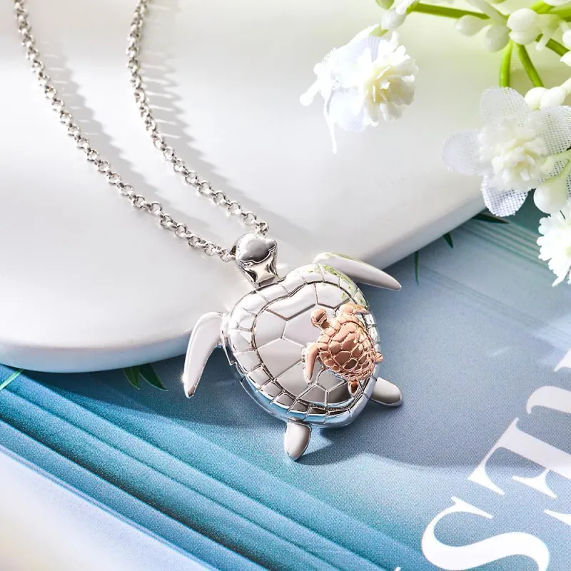 Personalized turtle locket necklace with heart-shaped photo inserts, featuring a mother and child image inside and a silver chain